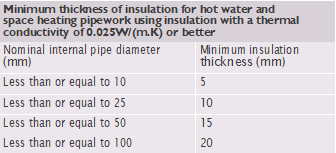 The table to the right shows the minimum thickness of insulation required for heating and hot water pipework. Note that this is for insulation with a thermal conductivity of 0.025W/(m.K) or better. If insulation with worse performance is used, then BS 5422 will need to be consulted.