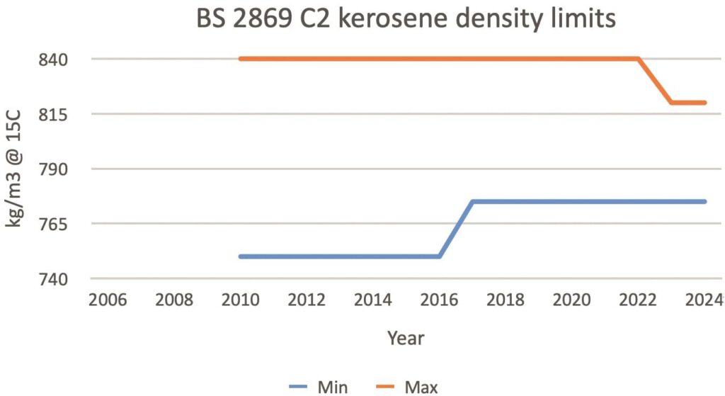 In terms of kerosene density range, the heating sector now enjoys the tightest specification since the 1960s, and this has resulted in significantly improved fuel consistency. Density is also the primary factor affecting the specific energy of the fuel.