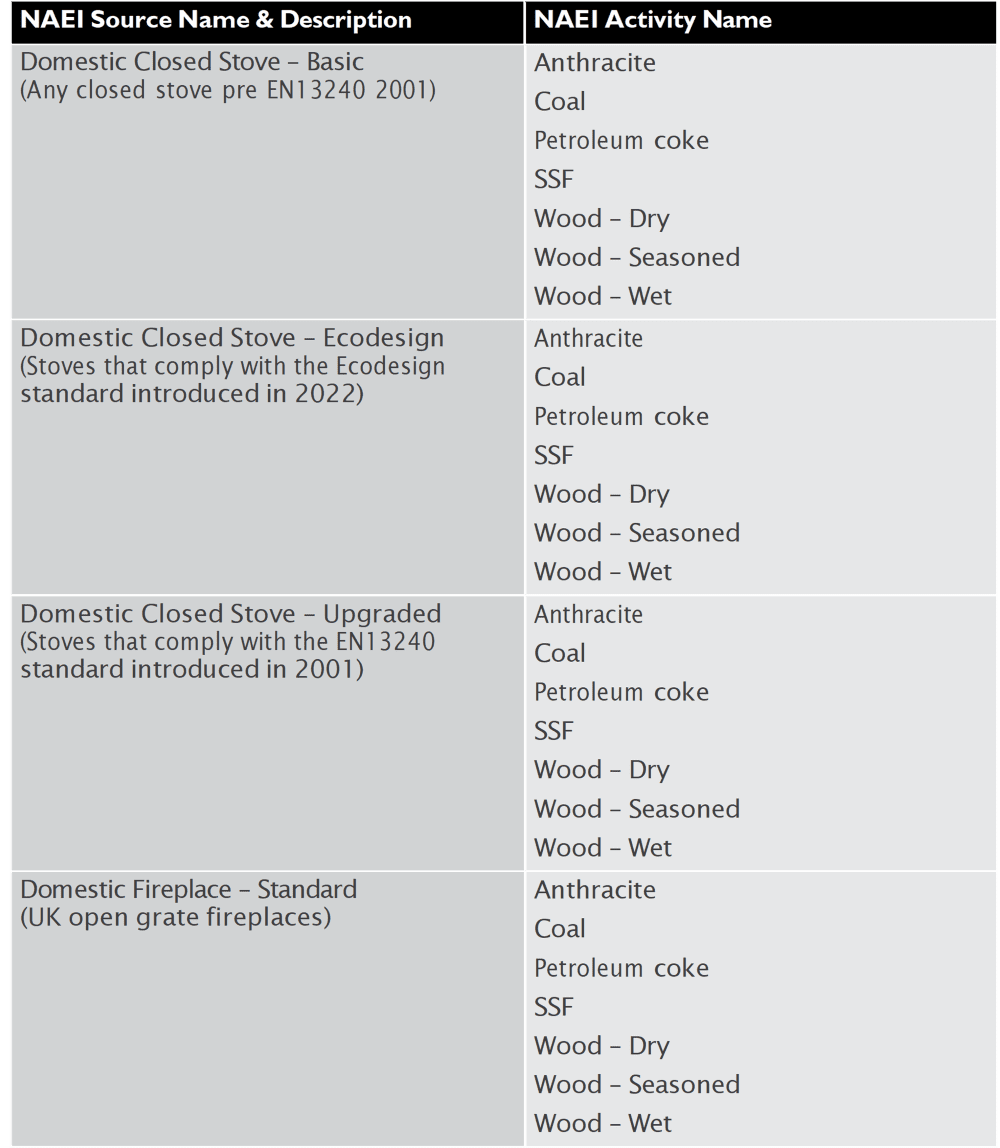 As is so often the case, it is the detail that paints the clearest picture and, the NAEI data tables are not short on detail. In fact, when we look closely the category usually referred to as ‘wood burning stoves’, we can see that this is an amalgamation of no less than 28 different data sets (see table).